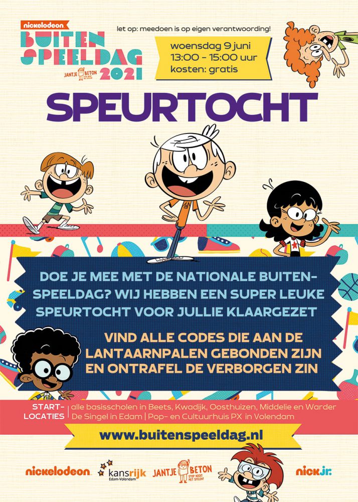 Woensdag 9 juni is het nationale buitenspeeldag en wij hebben een leuke speurtocht voor jullie uitgezet! Vind alle codes die aan de lantaarnpalen gebonden zijn en ontrafel de verborgen zin. Wil je ook meedoen? Kom dan naar één van de startlocaties in de gemeente Edam-Volendam: